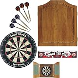 Everything you need to play the game of darts. This darts cabinet kit comes with an extended door cabinet made of specially selected pine with a furniture finish. The cabinet is constructed with finger joints for added strength, with high quality hinges making the doors adjustable. A professional tournament bristle dartboard, 2 sets of English brass darts and a durable Lexan starting throw line completes the kit.
