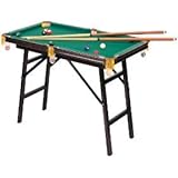 (More customer reviews)This is a very good quality pool table. It's foldable legs make it portable and the balls feel extremley realistic as well. My only gripes are that the cues feel a little cheap and that after chalking the cues some blue marks are left on the felt surface and the cue ball. The surface is cleanable with the brush but the cue ball's blue mark is perminant. Other than those gripes, it's a great item in terms of both price and quality.