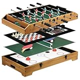 (More customer reviews)We bought this for our 8 and 4 year old boys. The product was damaged when it arrived (storage drawer broken). My husband attempted to assemble it anyway. The bottom panel for the foosball table was warped making that game unplayable because the handles couldn't spin freely. The ping pong panel was 'dead' so the imitation ball did not have much bounce. The pins to hold the net could not be inserted far enough into the table to stay perpendicular to the table so the net kept sliding off the pins. The air hockey puck kept getting stuck in the goal slot instead of going through it for a goal. The only surface that did not have issues was the chess/backgammon panel. Needless to say, it was promptly returned. We would not recommend this for any amount of money.