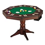 The ultimate bachelor table, the Harvard Bumper Maxx three-in-one combination table converts from a poker table to a bumper pool table to a dining table, all in just a few quick seconds. The poker table configuration includes a deck of cards and a box of poker chips, plus eight different playing stations, each with its own cup slot. Switch things around, however, and the surface turns into a bumper pool table, with an octagonal green wool/nylon blend play surface, solid wood rails with rubber cushions for a lively rebound, and plastic bumper pegs. And when you're finished playing games, the table converts once again into an attractive cherry-finished dining table. It's the perfect accessory for a game room, the office, or a space-challenged apartment. The Bumper Maxx--which also comes with a pair of 2-piece, 48-inch pool cues, a bumper pool ball set, a table brush, and two pieces of chalk--measures 52 by 32.125 by 52 inches (W x H x D) when fully assembled.