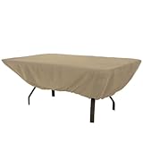 It\'s easy to spend a fortune on patio furniture and a few storms can wipe that fortune away. Protect against that with this heavy-duty table cover. It features Rain-Titefabric that protects against rain, snow, sun and dirt and won\'t crack in cold weather. Air vents reduce inside condensation and wind lofting and StayOnelastic loops fit over legs to keep cover on during high winds and breezy conditions. Includes an elastic cord in the bottom hem for a fast and custom fit. Rectangular cover works on tables up to 72in.L and 44in.W.